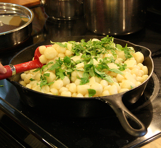 Once you add all the gnocchi to the pan, stir evenly to coat all the pieces with butter, saucing them.