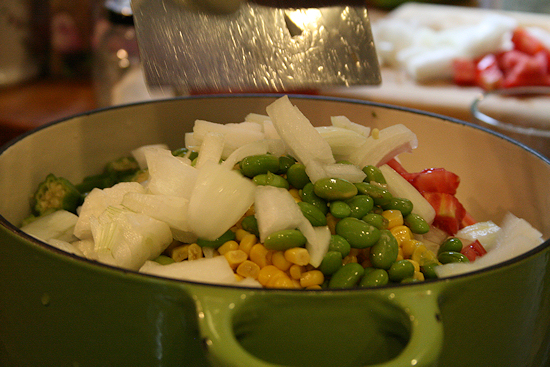 A very nice lady gave me a pile of fresh picked okra. Well, my first thought was “Oh! Fried okra.”. The tired part of me thought “Oh! I am going to stew this.”. So stew is just what I did. I had a handful of fresh picked tomatoes, an onion and some left over edamame and who doesn’t have canned corn? Best part of it all is it could not be easier. Simply slice dice and throw it in a pot!