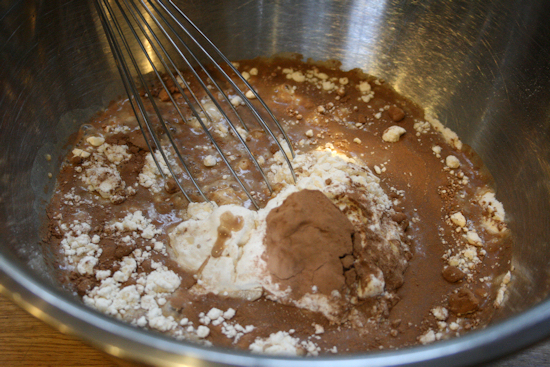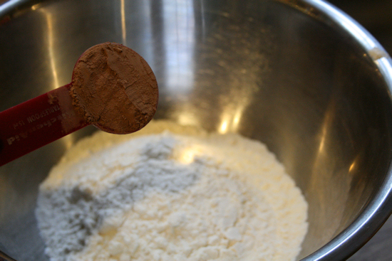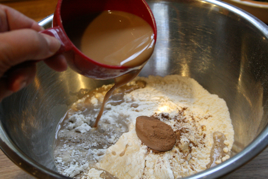 In a large bowl, add your pancake mix and spoon in your cocoa.