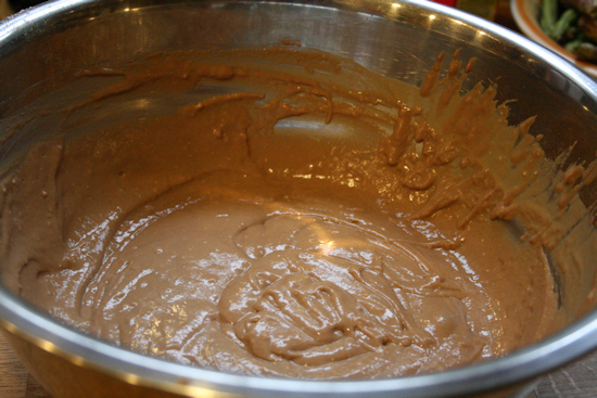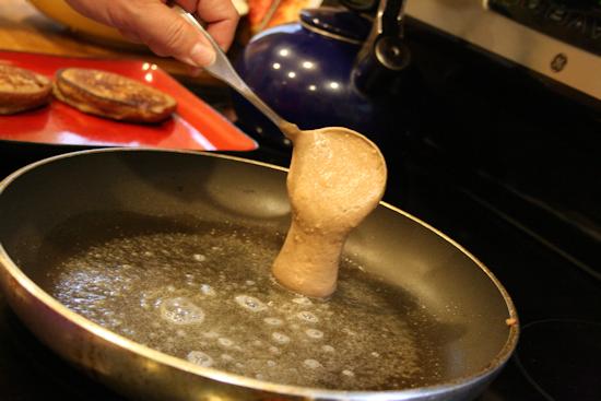 Ladle your batter into the pan. I can fit 3 nice size cakes in one pan.