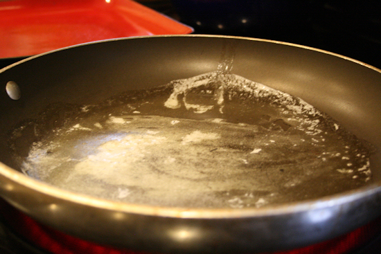 Next you will need a large skillet and a pat of butter. Melt butter in the pan slowly until nice and hot.