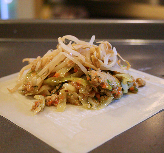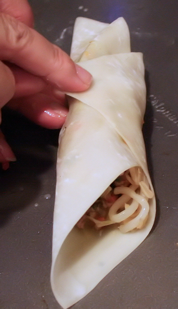 Put about 1/4 cup of the chicken filling just below the center of the wrapper, above the bottom point. Top with a pinch of sprouts.