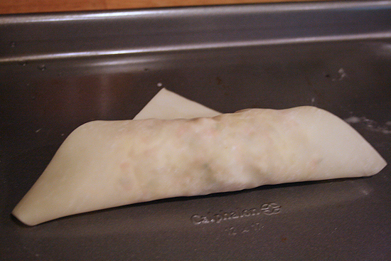 Place seam side down on the dusted cookie sheet. Repeat with the remaining wrappers and filling. (Note: If the egg rolls will not be cooked right away, lightly dust them with cornstarch to prevent them from sticking together, and cover tightly with plastic wrap. Refrigerate for up to 4 hours.) If your eggrolls are ready to bake, lightly brush them with the coconut oil.