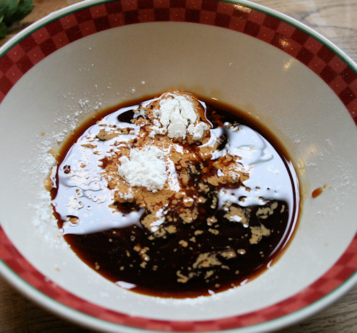 In a small bowl, add your soy sauce and sprinkle the cornstarch over the soy sauce until dissolved.
