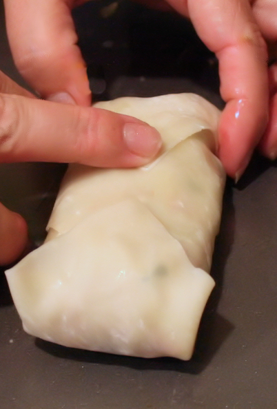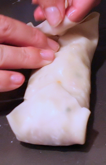 Pull the bottom point up over the filling, fold over the sides and roll up to completely enclose the filling. See below for step by step folding….