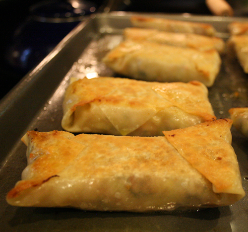 Bake the egg rolls for about 20 minutes, or until they are light brown and crispy on the outside, turning them over and rotating the baking sheet once.
