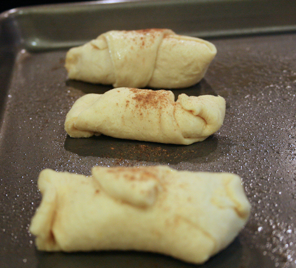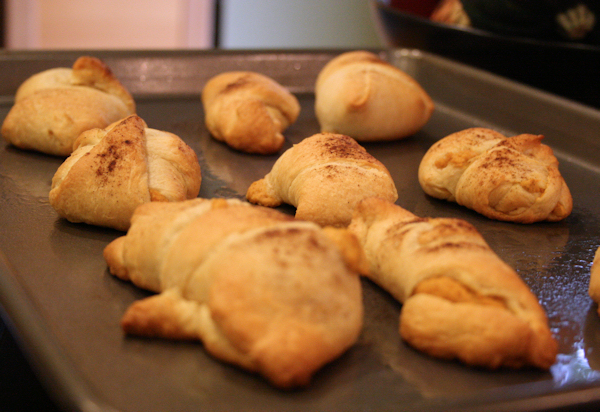 Take your crescents out of the oven. Don’t they look good? I gave each one a little sprinkle of the pumpkin pie spice before they went in.