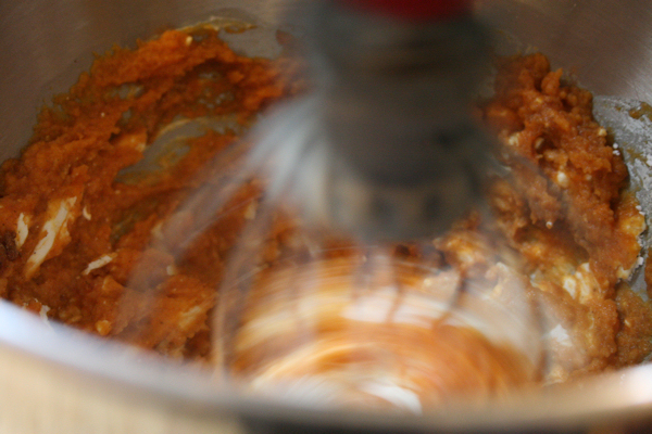In a mixing bowl, add the pumpkin filling ingredients. I used my mixer but you can use a hand mixer as well or stir by hand with a wooden spoon.