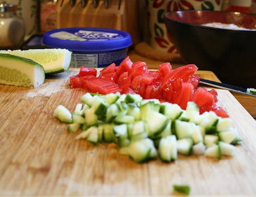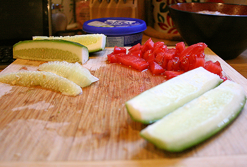 Next, start to prep all of your components. First thing to do is slice that cucumber and remove the seeds, then dice the tomato into small bite size pieces.