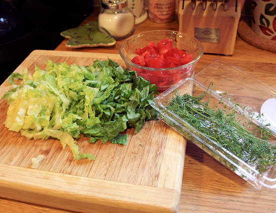 Next, rough chop the lettuce, get your dill out and a pair of scissors. The scissors make cutting the dill super easy.