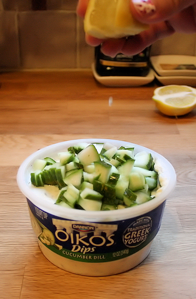 Into the Oikos dip, you will add the cucumber; about 1/2 cup (set the rest aside if you have some remaining) and 2 sprigs of dill. Just cut it right into the dip. Lastly, add the last big squeeze out of that lemon and stir.