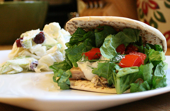 Fold and eat! I served this sandwich with my coconut cranberry apple slaw and it was so nice to sit outside at the end of the summer weather and eat something nice, light and refreshing. Can something this low calorie really taste so wonderful? You betchya!