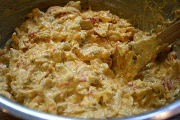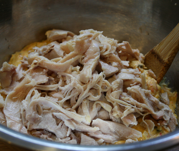Transfer your mixture into a large bowl and shred your cooked chicken into the filling.
