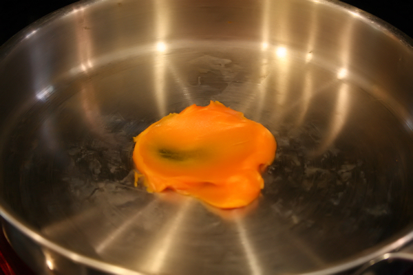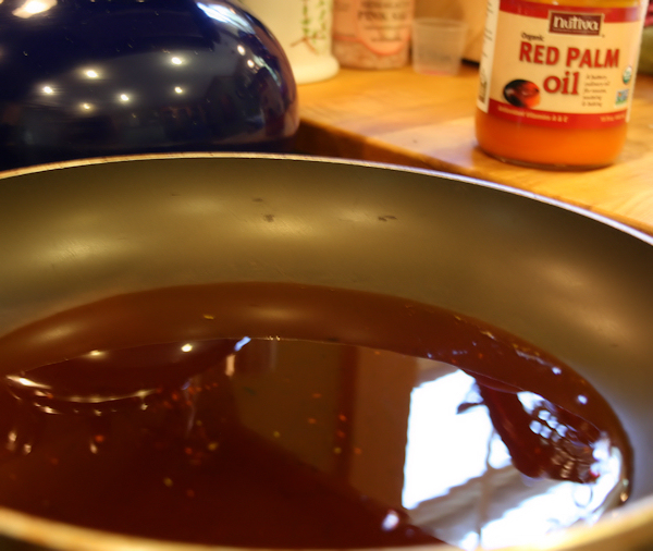 Place 2 tbs of the red palm oil into the pan and let it melt on medium heat.