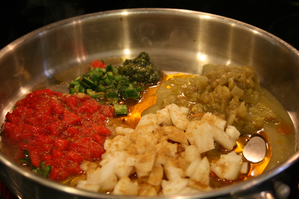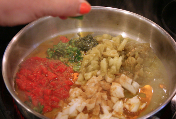 Add the serano, onion, chilies, red peppers, tomato and spices.