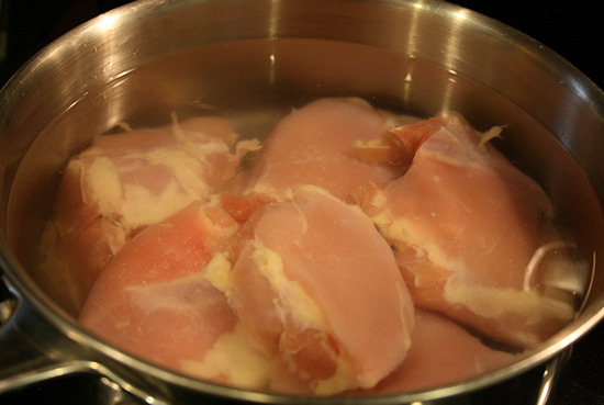 First, place a pack of 2lbs of boneless skinless thighs into some water and cook until your chicken is done. It will be a nice bright white and tender.