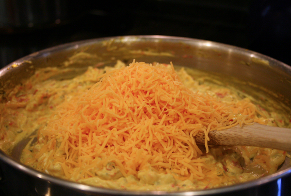 Next, add in the shredded cheddar cheese and stir.