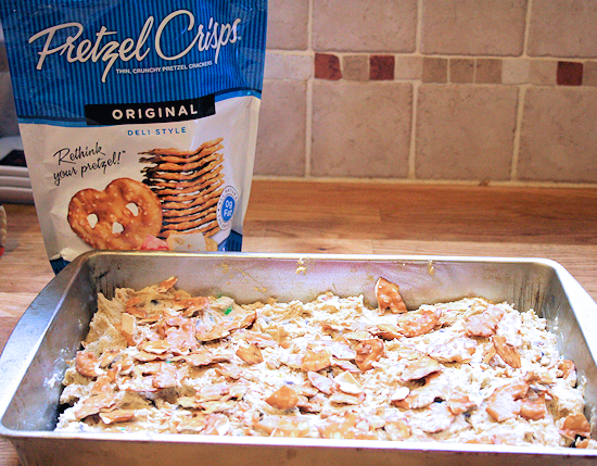After the pan is greased, line it with a layer of the whole Pretzel Crisps®.