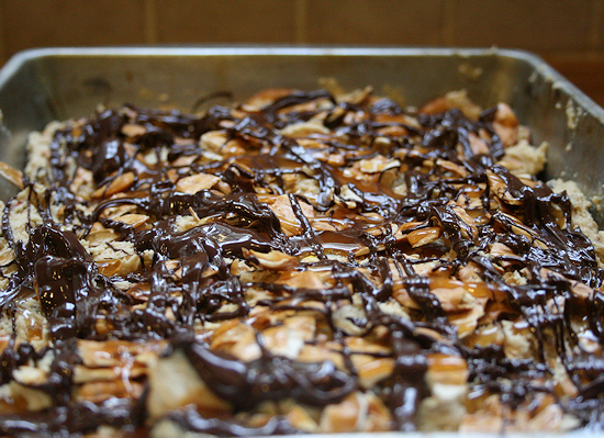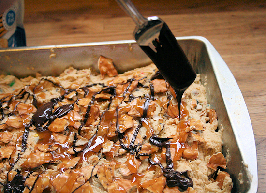 Drizzle the caramel and the melted chocolate right on top of the unbaked dough.