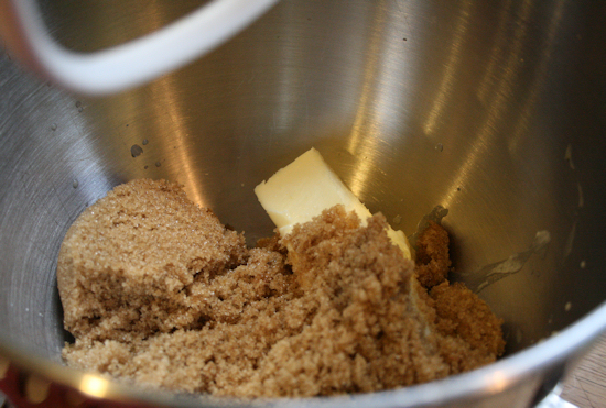 In a large bowl or a mixer, add the sugars and butter and beat until light and fluffy.