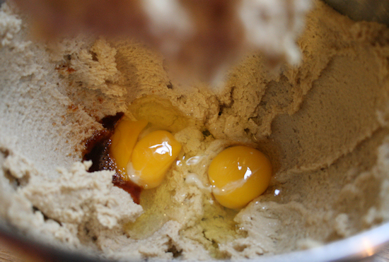 Add in the eggs and vanilla and mix.