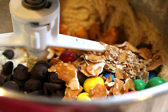 Next add flour, baking soda, salt and mix for 1 minute. Then add your M&M’S® Pretzel candies and the chocolate chips. Combine.