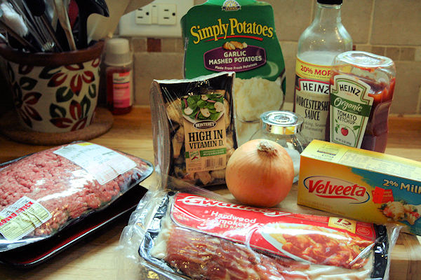 In a large bowl, add your hamburger meat and all of the listed ingredients except the cheese, butter and potatoes. That’s right, all of them! Your bacon should be cooling at this point and we will get to that in a minute.