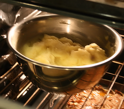 Put your meatloaf into a 375 degree oven and bake. While this is baking you can add your potatoes to a bowl and heat them up one of three ways. On the stove in a large pot, microwave them so they are nice and hot OR you can do what I did. I sprayed a metal bowl plopped them in and stuck them right in the oven with the meat loaf.