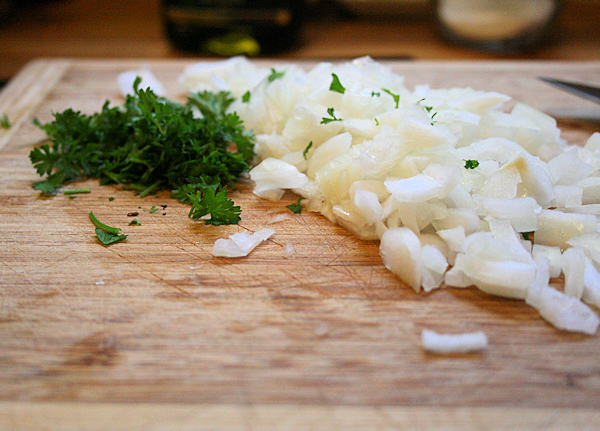 While the bacon was cooking, I took this time to chop my onion, parsley and mushrooms.