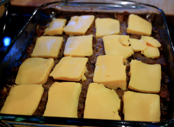 When the meatloaf is nice and brown and bubbly, take it out and layer the cheese right on top.