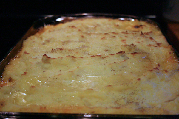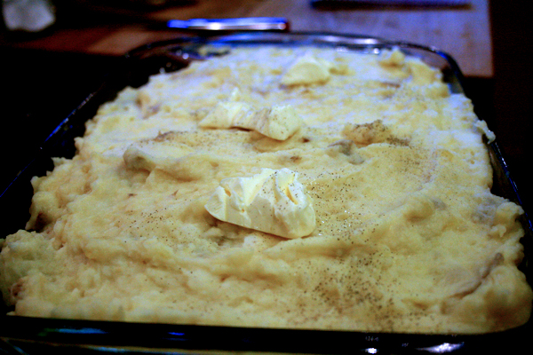 Top with the three pats of butter, lightly salt and pepper the top and slide back into the hot oven. When the top is golden brown and delicious looking it is done!