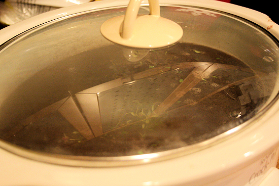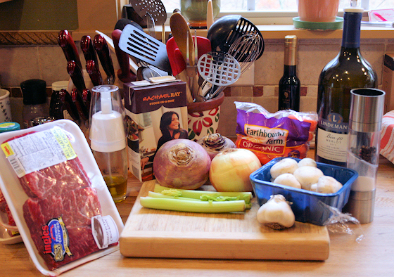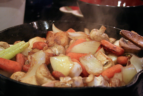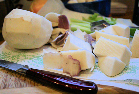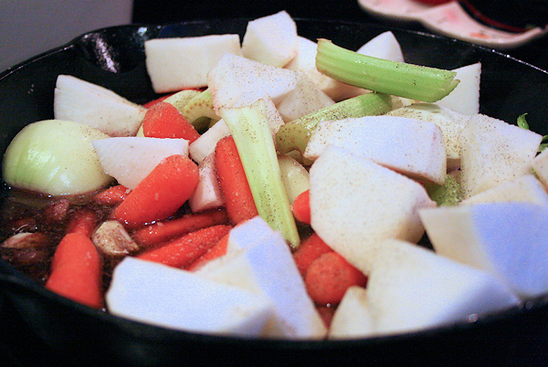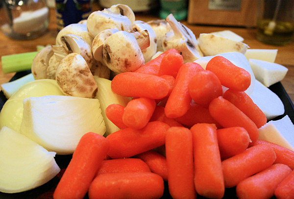 I like to get everything ready ahead of time, so I chopped and prepared all my veggies. Peel the turnips, wash the mushrooms, quarter the onion, etc….