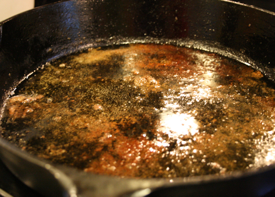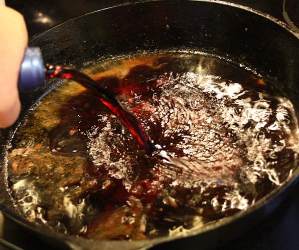 In the same pan, add 2 cups of wine, deglazing the pan and scraping off any of the yummy browned bits from the bottom.