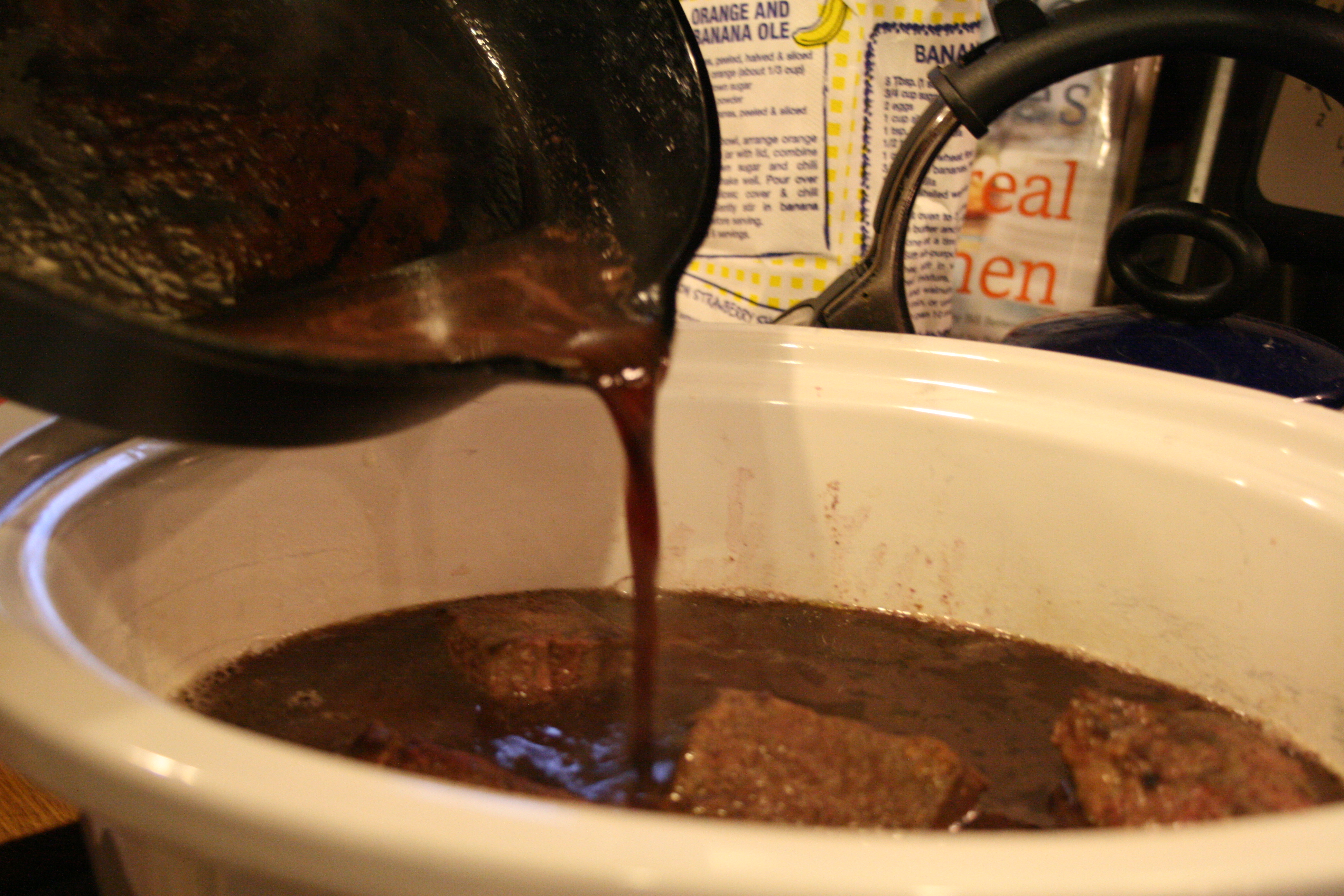 Reduce the wine by about half and and add into the crock pot right over the meat.