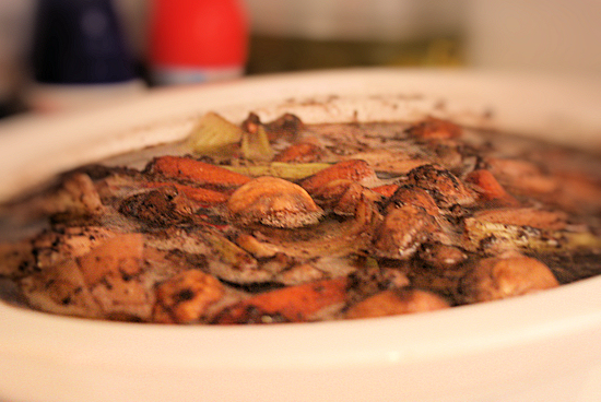 Set your crock pot to high and add the beef stock and the remaining 2 cups of red wine, rosemary and thyme. This will braise the meat until it is fork-tender. This should take 2 1/2 to 3 hours. Cover. During the last 1/2 hour of cooking, add back in the vegetables. Allow the ribs to cool in the liquid, then cover and refrigerate overnight. Yes refrigerate 🙂