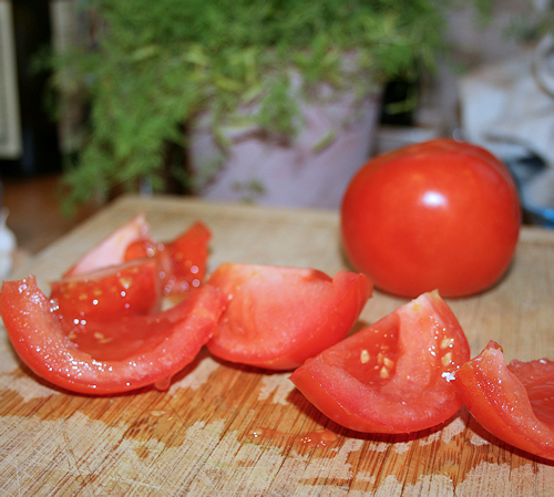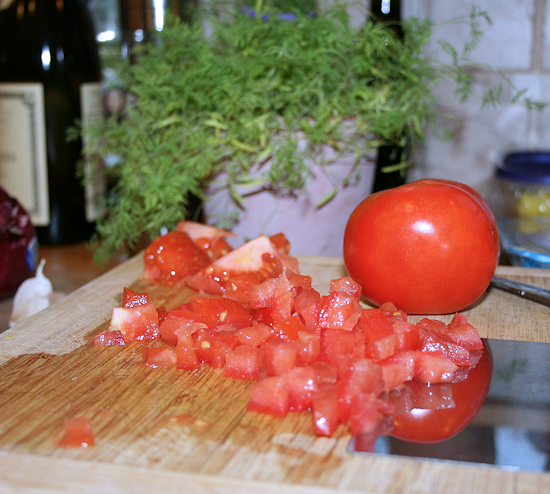 Take tomatoes and slice in quarters, de-seed and dice. To de-seed simply cut the middle away from the quarter.