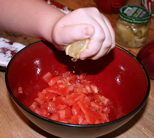 Take the tomatoes and put into a med. size bowl and squeeze 1/4 of a lemon right onto the tomatoes. The lemon gives this dish a wonderful brightness so try not to skip this step.