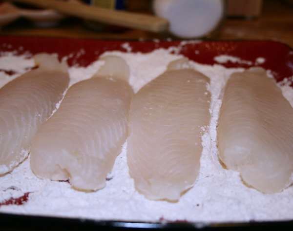 Get out the fish fillets and rinse under cold water. Lay each onto the plate of flour, making sure to cover each side. You don;t need egg, or a milk wash, rinsing them with water works just fine with the flour and keeps this dish nice and light.