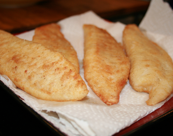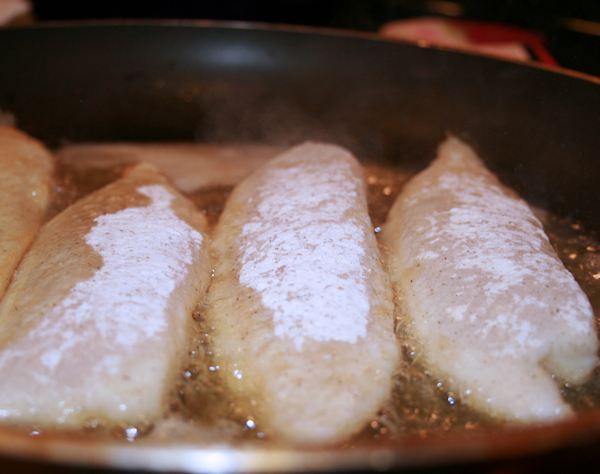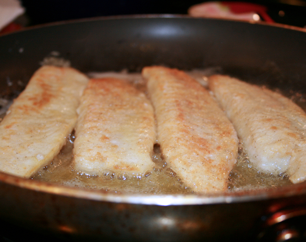 Place coated fish in the pan, laying them away from you so you don’t splatter and burn yourself. Cook each side about 4 minutes until golden brown.