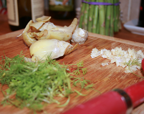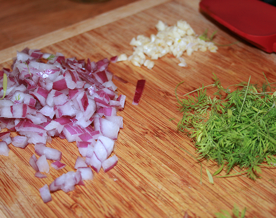 Drain the marinated artichoke hearts and roughly chop that long with the fresh dill. Dice the onion and garlic into small pieces.