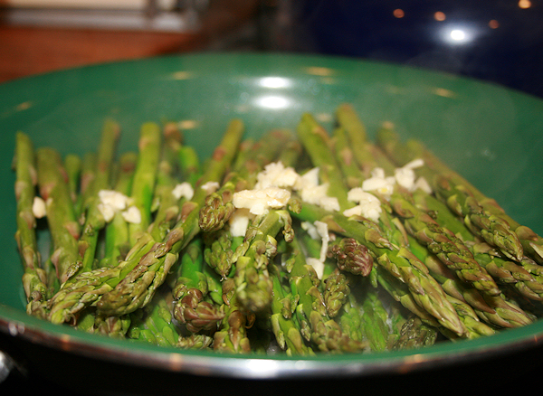 While this is simmering for about 5 to 10 minutes on a low simmer, is when I started my asparagus in the pan. I added 2 Tbs of olive oil, 2 cloves of minced garlic and the asparagus. Add about 1/4 cup of water to steam when the pan is hot.