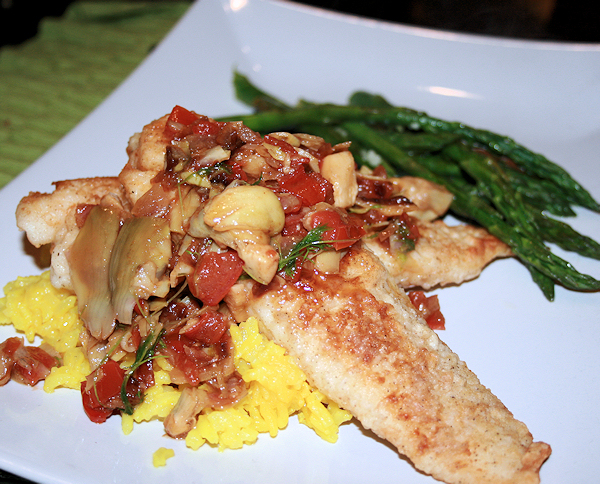 I love fish, but I like to try new flavors whenever I can. I tend to steer away from simmering anything in straight tomato sauce so this sauce is a great alternative when you want to incorporate some freshness into a dish but not overpower what you are cooking. I love artichokes, love them! Whenever I find a new way to use them, the flavor always pays off. This light fish, with the tomato wine reduction and artichoke is a winner. It reminds me of a Greek bruchetta tapenade with a hint of lemon to bring it all together. Served with fresh sauteed asparagus and garlic.