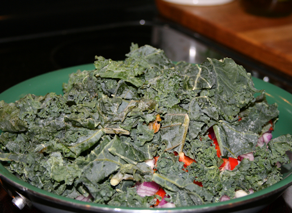 After you have diced your onions and peppers, toss into the pan to saute on medium until semi translucent. Add in 2 cups of kale and salt. Saute until the kale becomes bright and wilted.
