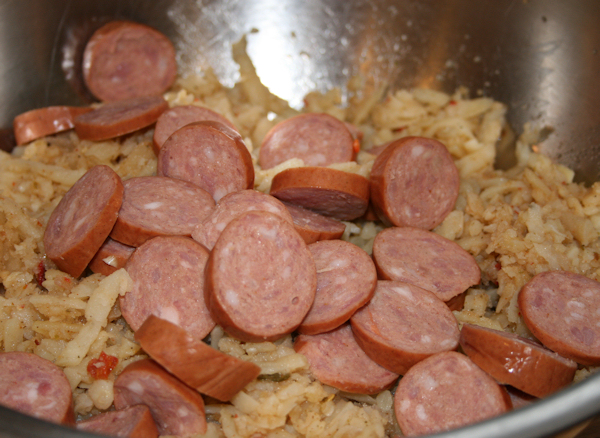 Slice the kielbasa into discs and put into the bowl with the potatoes.