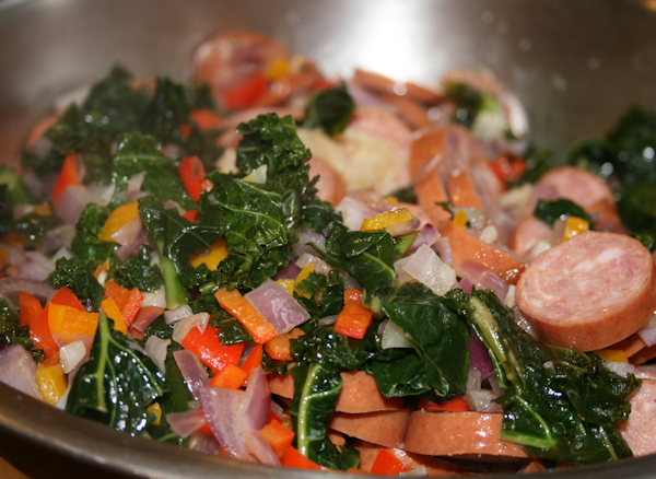 Remember these potatoes are already cooked so no need to heat up ahead of time. Add in the onion, pepper and kale mixture from the stove.