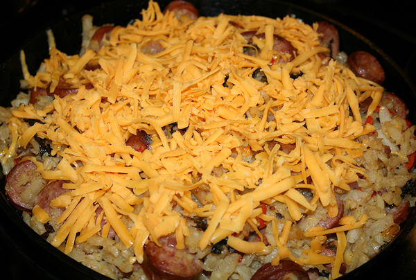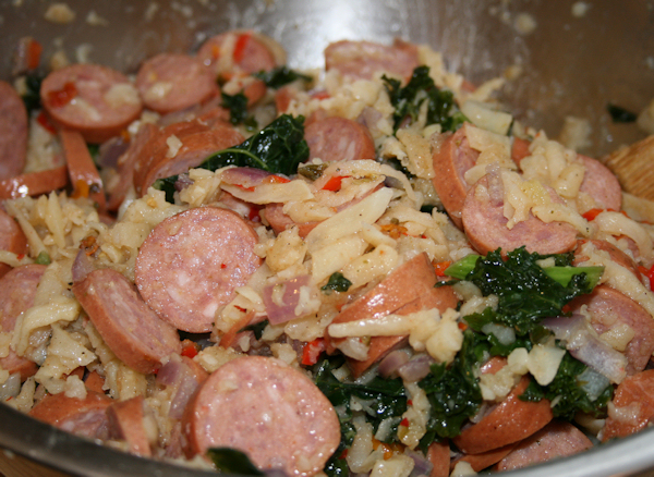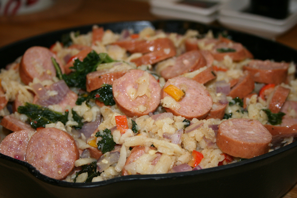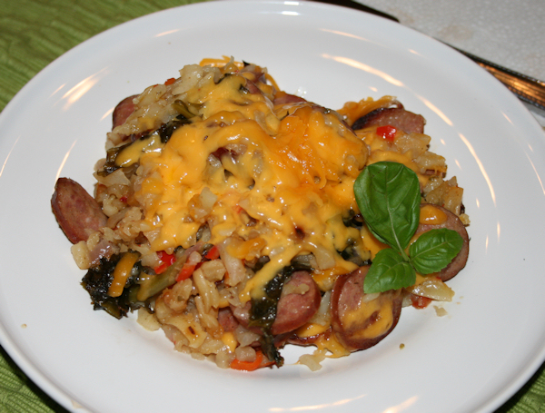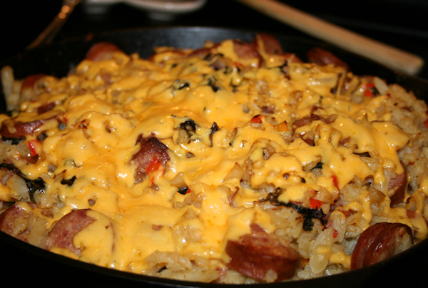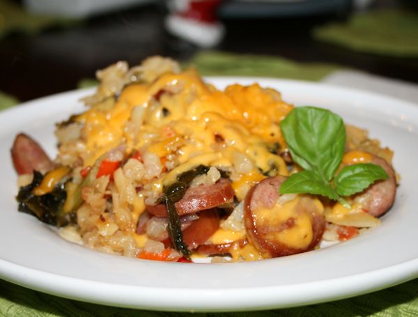 This one pot meal was perfect for being snowed in. It was easy and lucky for me, I had everything on hand. Zesty potatoes took the place of needed spices and the sausage was filling. The mix of peppers, sausage and onions are classic, after all and the kale just added to that zip of flavors. I used colby cheese on top which seems to make everything more mild. It had nothing to do with the fact that I love cheese and it goes with everything. Simple, filling, yummy and in one pot, you can’t go wrong!
