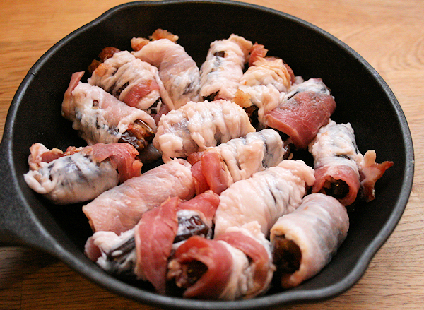 Once all of the dates have been rolled, place them in a stove/oven safe pan to sear them off in. I used a small cast iron pan. Place then seam down in the pan, snug is fine.