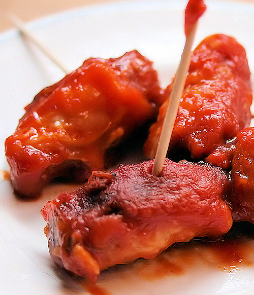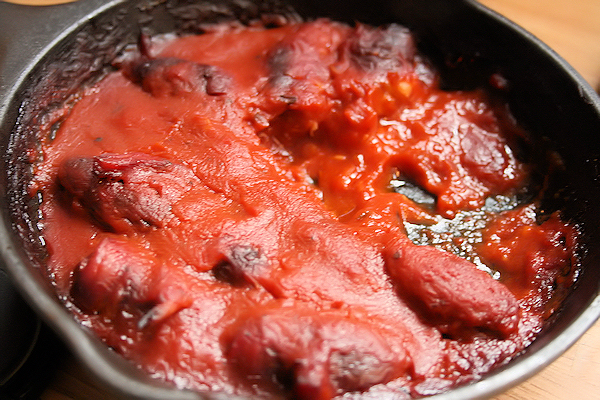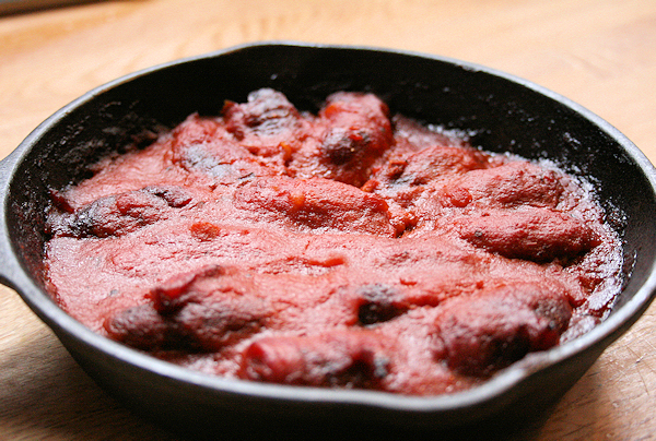 Remove the oven, stick each date with a toothpick and serve warm. I like to serve them right in the pan with a trivet underneath. This keeps the dish nice and warm. My husband was stumped the first time he tried these, wondering how a date could transform into this wonderful mouthful. He now asks for this every holiday and every dinner occasion, but coming the from the man who asks for pizza three times a week this is not surprising. He loves anything with sauce.