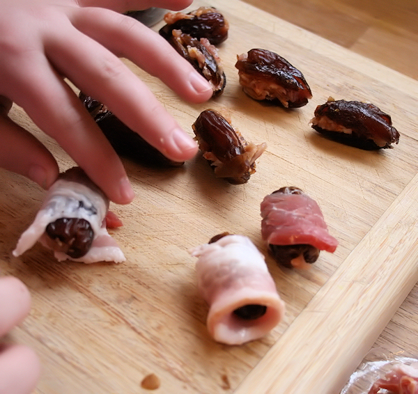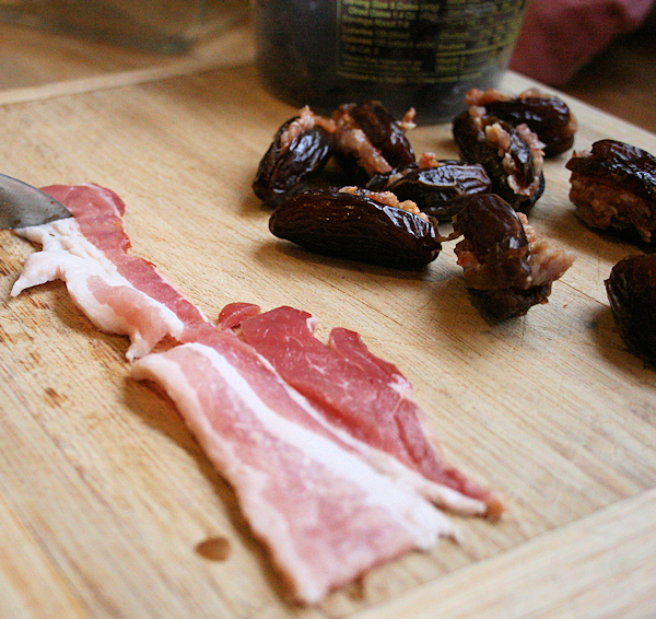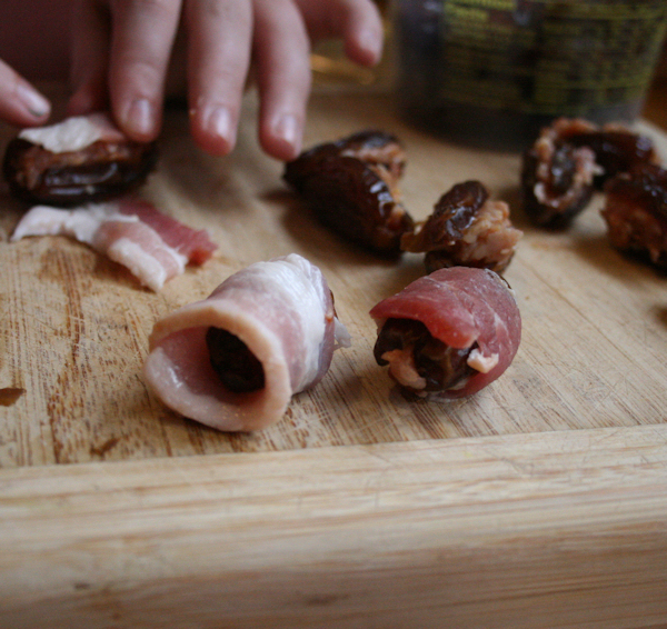 Take each stuffed date and wrap in one of the halved slices of bacon, rolling completely around the date.
