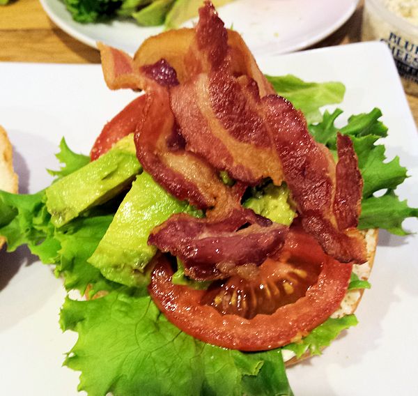 On the other side start layering the good stuff, lettuce, avocado, tomato and of course the bacon.